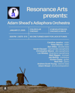 Adam Shead is a multi-disciplinary artist living in Chicago, IL whose practice spans the realms of improvised music, music composition, painting, photography, and poetry. Throughout Shead’s practice he attempts to create work that develops a sense of spacial presence in which the codification of human experience is dismantled and the prevailing homogenization of culture takes a back seat to personal truth, encouraging the invention of new and personal ways of expressing and knowing oneself. Through this exploration of truth Shead hopes to develop work that allows a moment of reprieve while simultaneously challenging himself and his audience through active participation in invention, acceptance, compassion, trust, and grace.